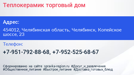 Теплокерамик, торговый дом по адресу 454012, Челябинская область, Челябинск, Копейское шоссе, 23 в дальнейшем Организация, размещена в следующих категориях: