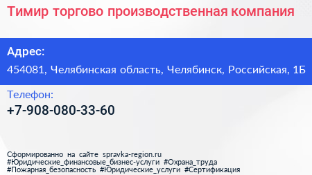 Тимир, торгово-производственная компания по адресу 454081, Челябинская область, Челябинск, Российская, 1Б в дальнейшем Организация, размещена в следующих категориях: