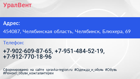 УралВент по адресу 454087, Челябинская область, Челябинск, Блюхера, 69 в дальнейшем Организация, размещена в следующих категориях: