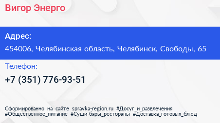 Вигор-Энерго по адресу 454006, Челябинская область, Челябинск, Свободы, 65 в дальнейшем Организация, размещена в следующих категориях: