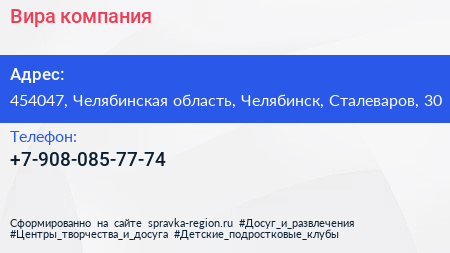 Вира, компания по адресу 454047, Челябинская область, Челябинск, Сталеваров, 30 в дальнейшем Организация, размещена в следующих категориях:
