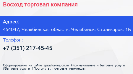 Для связи с организацией воспользуйтесь номером телефона: +7 (351) 217-45-45. Пн: c 09:00-18:00, Вт: c 09:00-18:00, Ср: c 09:00-18:00, Чт: c 09:00-18:00, Пт: c 09:00-18:00, Сб: выходной, Вс: выходной, вы можете обратиться в эту организацию.