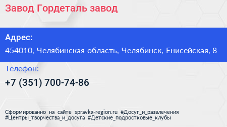 Завод Гордеталь, завод по адресу 454010, Челябинская область, Челябинск, Енисейская, 8 в дальнейшем Организация, размещена в следующих категориях: