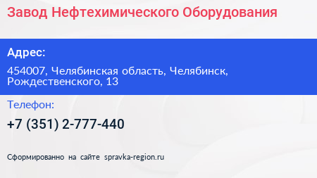 Завод Нефтехимического Оборудования по адресу 454007, Челябинская область, Челябинск, Рождественского, 13 в дальнейшем Организация, размещена в следующих категориях:
