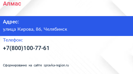 Алмас по адресу улица Кирова, 86, Челябинск в дальнейшем Организация, размещена в следующих категориях: