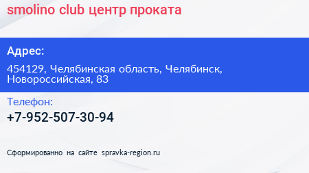 smolino.club, центр проката по адресу 454129, Челябинская область, Челябинск, Новороссийская, 83 в дальнейшем Организация, размещена в следующих категориях: