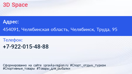 3D Space по адресу 454091, Челябинская область, Челябинск, Труда, 95 в дальнейшем Организация, размещена в следующих категориях: