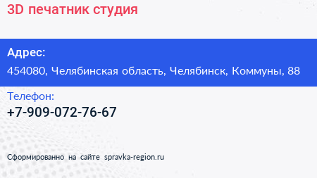 3D печатник, студия по адресу 454080, Челябинская область, Челябинск, Коммуны, 88 в дальнейшем Организация, размещена в следующих категориях: