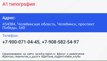 А1, типография по адресу 454084, Челябинская область, Челябинск, проспект Победы, 160 в дальнейшем Организация, размещена в следующих категориях: