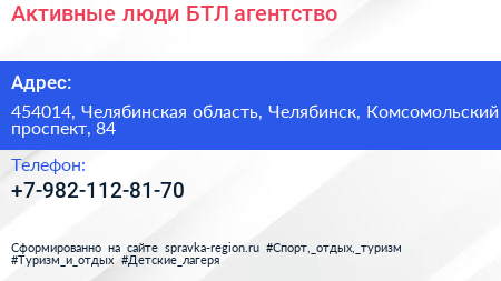 Активные люди, БТЛ-агентство по адресу 454014, Челябинская область, Челябинск, Комсомольский проспект, 84 в дальнейшем Организация, размещена в следующих категориях: