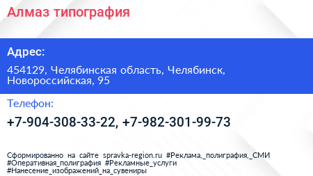 Алмаз, типография по адресу 454129, Челябинская область, Челябинск, Новороссийская, 95 в дальнейшем Организация, размещена в следующих категориях:
