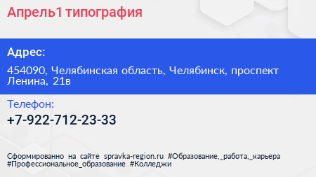 Апрель1, типография по адресу 454090, Челябинская область, Челябинск, проспект Ленина, 21в в дальнейшем Организация, размещена в следующих категориях: