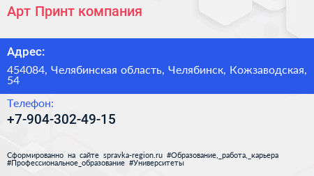 Арт-Принт, компания по адресу 454084, Челябинская область, Челябинск, Кожзаводская, 54 в дальнейшем Организация, размещена в следующих категориях: