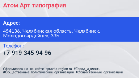 Атом Арт, типография по адресу 454136, Челябинская область, Челябинск, Молодогвардейцев, 33Б в дальнейшем Организация, размещена в следующих категориях: