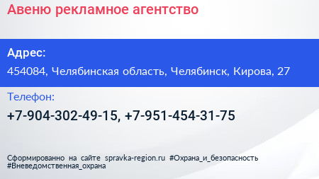 Авеню, рекламное агентство по адресу 454084, Челябинская область, Челябинск, Кирова, 27 в дальнейшем Организация, размещена в следующих категориях: