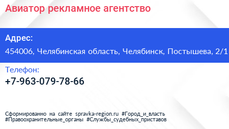Авиатор, рекламное агентство по адресу 454006, Челябинская область, Челябинск, Постышева, 2/1 в дальнейшем Организация, размещена в следующих категориях: