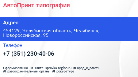 АвтоПринт, типография по адресу 454129, Челябинская область, Челябинск, Новороссийская, 95 в дальнейшем Организация, размещена в следующих категориях: