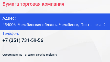 Бумага, торговая компания по адресу 454006, Челябинская область, Челябинск, Постышева, 2 в дальнейшем Организация, размещена в следующих категориях: