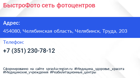 БыстроФото, сеть фотоцентров по адресу 454080, Челябинская область, Челябинск, Труда, 203 в дальнейшем Организация, размещена в следующих категориях:
