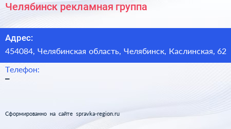 Челябинск, рекламная группа по адресу 454084, Челябинская область, Челябинск, Каслинская, 62 в дальнейшем Организация, размещена в следующих категориях: