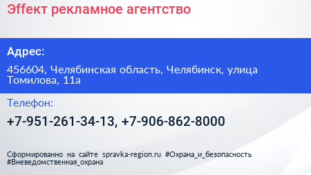 Эffект, рекламное агентство по адресу 456604, Челябинская область, Челябинск, улица Томилова, 11а в дальнейшем Организация, размещена в следующих категориях: