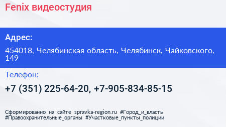 Fenix, видеостудия по адресу 454018, Челябинская область, Челябинск, Чайковского, 149 в дальнейшем Организация, размещена в следующих категориях: