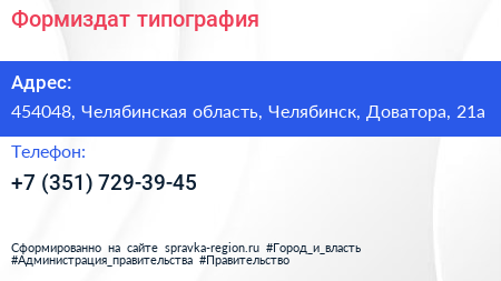 Формиздат, типография по адресу 454048, Челябинская область, Челябинск, Доватора, 21а в дальнейшем Организация, размещена в следующих категориях:
