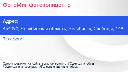 ФотоМиг, фотокопицентр по адресу 454090, Челябинская область, Челябинск, Свободы, 149 в дальнейшем Организация, размещена в следующих категориях: