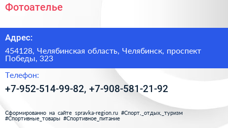Фотоателье по адресу 454128, Челябинская область, Челябинск, проспект Победы, 323 в дальнейшем Организация, размещена в следующих категориях: