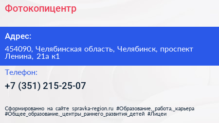 Фотокопицентр по адресу 454090, Челябинская область, Челябинск, проспект Ленина, 21а к1 в дальнейшем Организация, размещена в следующих категориях: