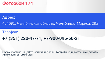 Для связи с организацией воспользуйтесь номером телефона: +7 (351) 220-47-71, +7-900-095-60-21.