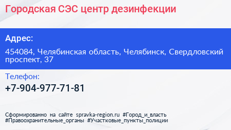 Городская СЭС, центр дезинфекции по адресу 454084, Челябинская область, Челябинск, Свердловский проспект, 37 в дальнейшем Организация, размещена в следующих категориях: