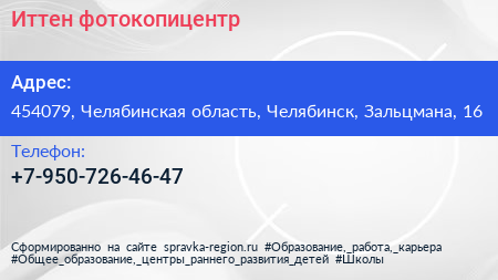 Иттен, фотокопицентр по адресу 454079, Челябинская область, Челябинск, Зальцмана, 16 в дальнейшем Организация, размещена в следующих категориях: