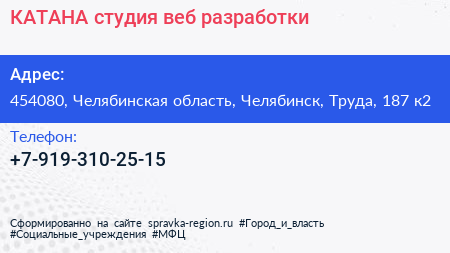 КАТАНА, студия веб-разработки по адресу 454080, Челябинская область, Челябинск, Труда, 187 к2 в дальнейшем Организация, размещена в следующих категориях: