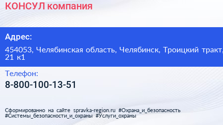 КОНСУЛ, компания по адресу 454053, Челябинская область, Челябинск, Троицкий тракт, 21 к1 в дальнейшем Организация, размещена в следующих категориях: