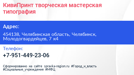 КивиПринт, творческая мастерская-типография по адресу 454138, Челябинская область, Челябинск, Молодогвардейцев, 7 к4 в дальнейшем Организация, размещена в следующих категориях: