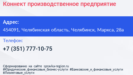 Коннект, производственное предприятие по адресу 454091, Челябинская область, Челябинск, Маркса, 28а в дальнейшем Организация, размещена в следующих категориях:
