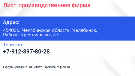 Лист, производственная фирма по адресу 454036, Челябинская область, Челябинск, Рабоче-Крестьянская, 47 в дальнейшем Организация, размещена в следующих категориях:
