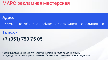 МАРС, рекламная мастерская по адресу 454902, Челябинская область, Челябинск, Тополиная, 2а в дальнейшем Организация, размещена в следующих категориях: