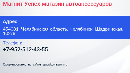 Магнит+Успех, магазин автоаксессуаров по адресу 454081, Челябинская область, Челябинск, Шадринская, 102/8 в дальнейшем Организация, размещена в следующих категориях: