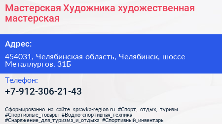 Мастерская Художника, художественная мастерская по адресу 454031, Челябинская область, Челябинск, шоссе Металлургов, 31Б в дальнейшем Организация, размещена в следующих категориях:
