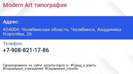 Modern Art, типография по адресу 454004, Челябинская область, Челябинск, Академика Королёва, 26 в дальнейшем Организация, размещена в следующих категориях: