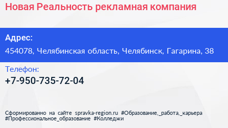 Новая Реальность, рекламная компания по адресу 454078, Челябинская область, Челябинск, Гагарина, 38 в дальнейшем Организация, размещена в следующих категориях: