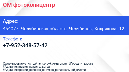 ОМ, фотокопицентр по адресу 454077, Челябинская область, Челябинск, Хохрякова, 12 в дальнейшем Организация, размещена в следующих категориях: