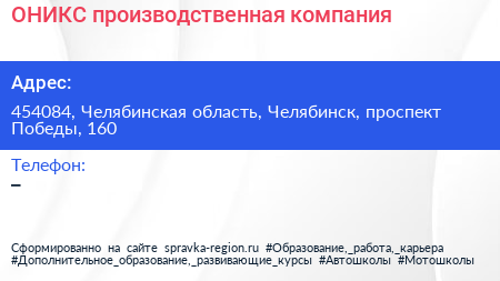 ОНИКС, производственная компания по адресу 454084, Челябинская область, Челябинск, проспект Победы, 160 в дальнейшем Организация, размещена в следующих категориях:
