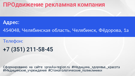 ПРОдвижение, рекламная компания по адресу 454048, Челябинская область, Челябинск, Фёдорова, 1а в дальнейшем Организация, размещена в следующих категориях: