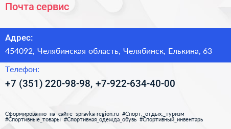 Для связи с организацией воспользуйтесь номером телефона: +7 (351) 220-98-98, +7-922-634-40-00. Пн: c 09:00-18:00, Вт: c 09:00-18:00, Ср: c 09:00-18:00, Чт: c 09:00-18:00, Пт: c 09:00-18:00, Сб: выходной, Вс: выходной, вы можете обратиться в эту организацию.