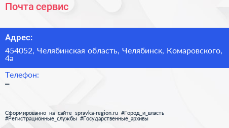 Почта-сервис по адресу 454052, Челябинская область, Челябинск, Комаровского, 4а в дальнейшем Организация, размещена в следующих категориях: