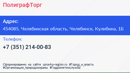 ПолиграфТорг по адресу 454085, Челябинская область, Челябинск, Кулибина, 1Б в дальнейшем Организация, размещена в следующих категориях: