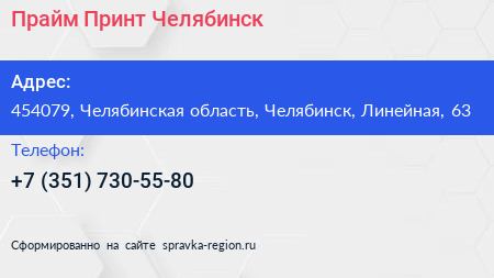Прайм Принт Челябинск по адресу 454079, Челябинская область, Челябинск, Линейная, 63 в дальнейшем Организация, размещена в следующих категориях: